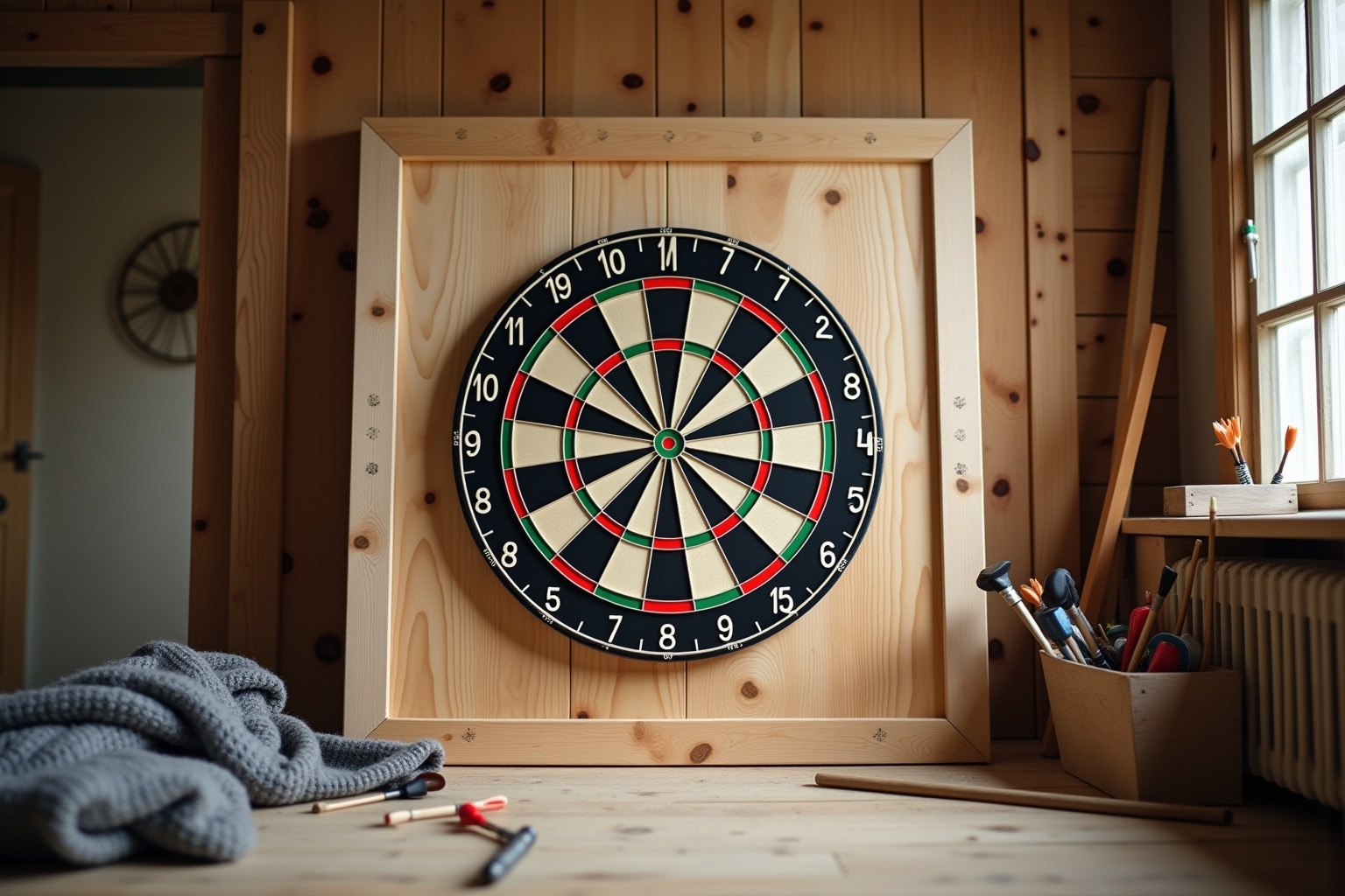 - Beleuchtung: Experimentiere mit verschiedenen Beleuchtungsmöglichkeiten. Du kannst ein LED-Leuchtband anbringen, um den Wandschutz indirekt zu beleuchten, oder Spotlights verwenden, um die Dartscheibe hervorzuheben.